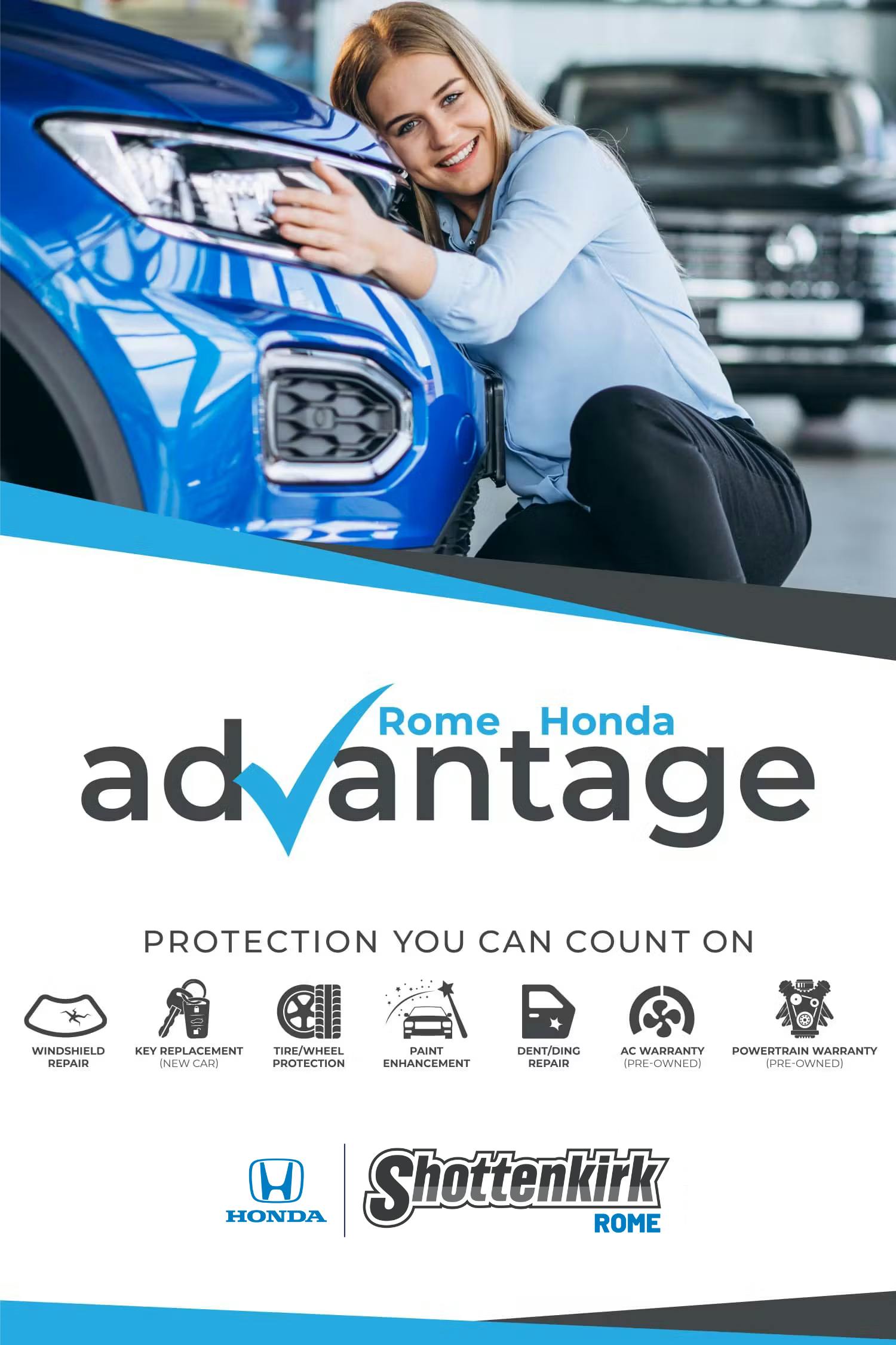 Tax, title, license, document fee extra. New/Pre-owned vehicles come with $895 Rome Honda Advantage Package: Dent/Ding repair. Tire/Wheel Protection. Windshield Repair. Key Replacement (new vehicles) and Paint enhancement. Complimentary 6 Month / 6,000 mile Powertrain Coverage and AC Warranty for pre-owned. AC Warranty and Powertrain excludes some vehicles – see dealer for details.